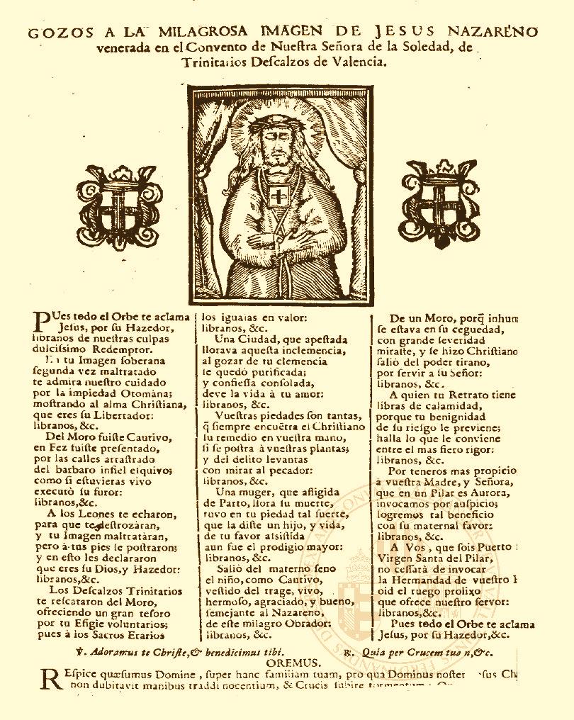 Nos cuenta el texto piadoso de este gozo que esta talla de Jesús Nazareno estuvo en poder de los infieles otomanos y que llegó a ser arrastrada por las calles de Fez. También dice que fue arrojada a los leones para ser devorada pero que fue respetada por estos. Tiempo después, fue rescatada por los trinitarios descalzos, previo pago de su botín, y fue protectora contra pestes y partos.